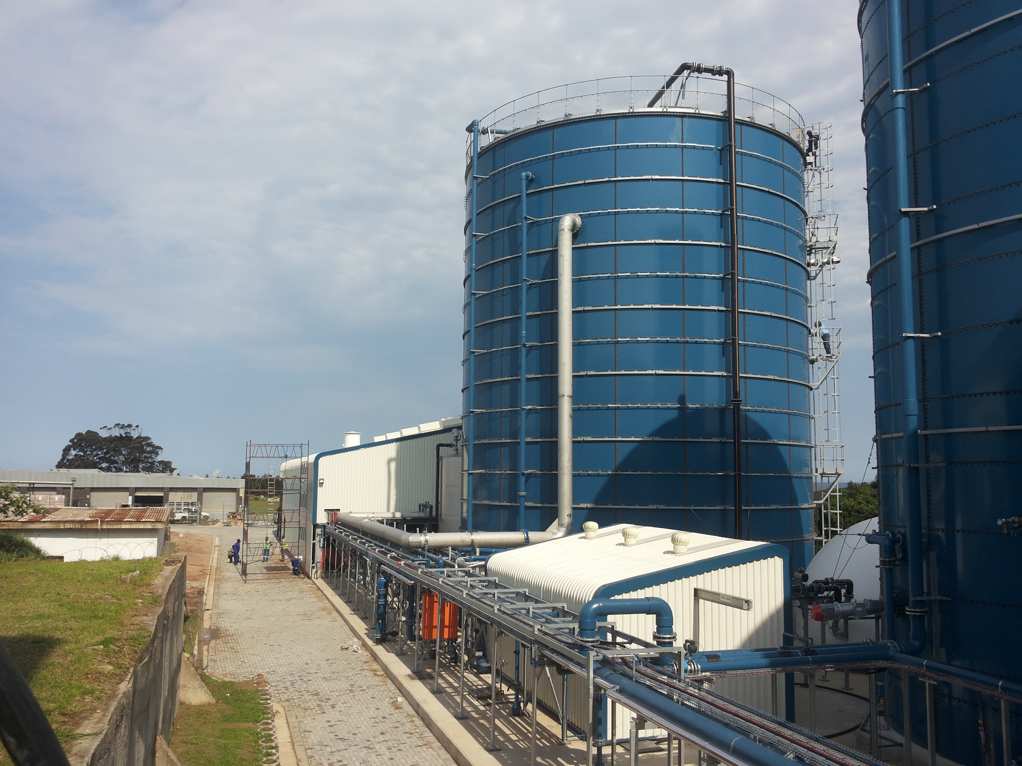 Hence the membranes are periodically backwashed with (clean) permeate at a high flux rate and a Cleaning In Place (CIP) unit allows the UF membranes to be chemically cleaned without the need for removal of the membrane modules. The COD load removed in the anaerobic digester is for the largest part converted into biogas, a mixture consisting mostly of methane (CH4) and carbon dioxide (CO2). To prevent an excessive biomass concentration in the digester, which will have a negative effect on membrane performance, Waste Anaerobic Sludge (WAnS) is discharged periodically. A sludge dewatering unit, consisting of a decanter centrifuge and a polymer dosing unit, produces dewatered sludge that is deposited into a sludge container for agricultural land application. The pressure in the anaerobic digester is controlled by a gas holder. The produced biogas is sent to a steam boiler or can be sent to the flare.
