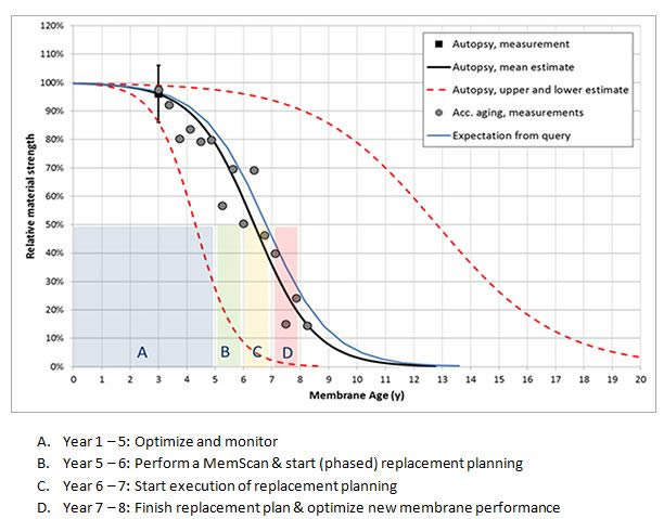 The MemScan gives you insight on the remaining lifetime of your X-Flow modules and offers the clarity you need to allocate the budgetary means in a timely manner to implement a properly phased replacement plan. The aging of membranes is inevitable, but the aging speed depends on many external factors, including temperatures, pH, coagulants, and the levels of exposure to chemicals. Certain combinations of these factors may work as a catalyst for increased aging speed.